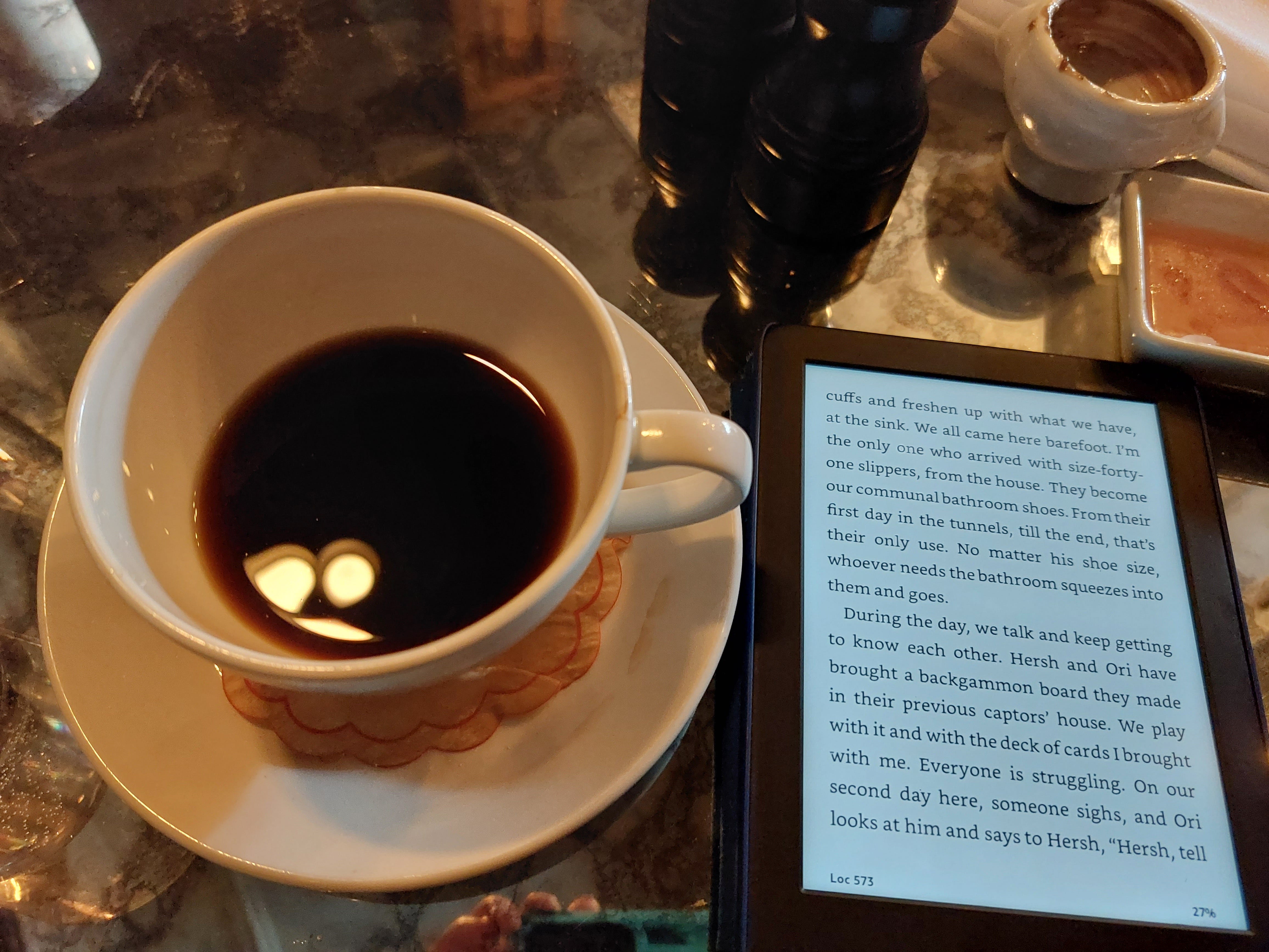 For the rest of the afternoon, we relaxed in the Marlton Espresso Bar at Susannah’s invitation. I treated myself to some salmon and toast, which I ate so fast I didn’t fulfill my millennial obligation to take a picture and post it. But I did take this picture of my coffee and Kindle, open to Eli Sharabi’s gripping Hamas captivity memoir Hostage. This was apparently Susannah’s first time seeing a Kindle in the wild, which she mistook for “the biggest phone I have ever seen.” Here Bethany chimed in that in fairness to Susannah, I do make it look bigger.