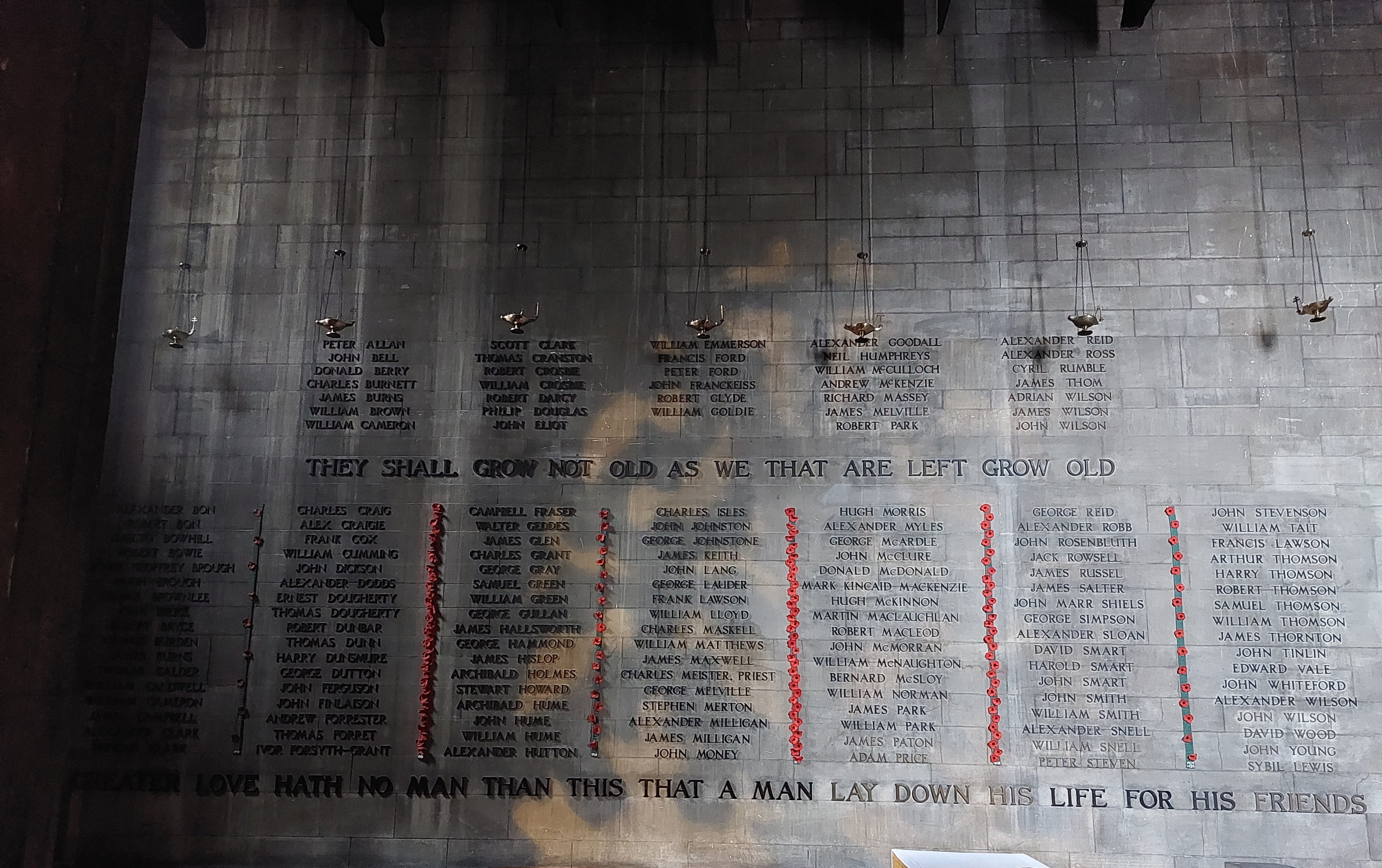 Waiting for the train, I notice a plaque commemorating the Quintinshill Rail Disaster, the worst railway accident in the history of the UK. On May 22, 1915, three trains collided near Gretna Green (which is close to the border with England). One of them was a troop train carrying Scottish troops who would die before they ever reached a field of battle. The death toll was over 200. Those who weren’t killed on impact with the one train were cut down by the other as they tried to scramble out. Several of the men attended Old Saint Paul’s, and their names are recorded on the wall I’ve come to photograph. I think about the poignancy of commemorating them together with their brothers who did have a chance to prove themselves in combat—all of them having, in their own way, given all.