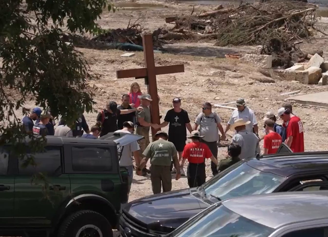A group of first responders takes hands to pray around a giant cross. They are in Kerr County, Texas, arrived to search and care for victims of the Guadalupe River flood. Not far away, the body of a 9-month-old baby has been found in the debris.
