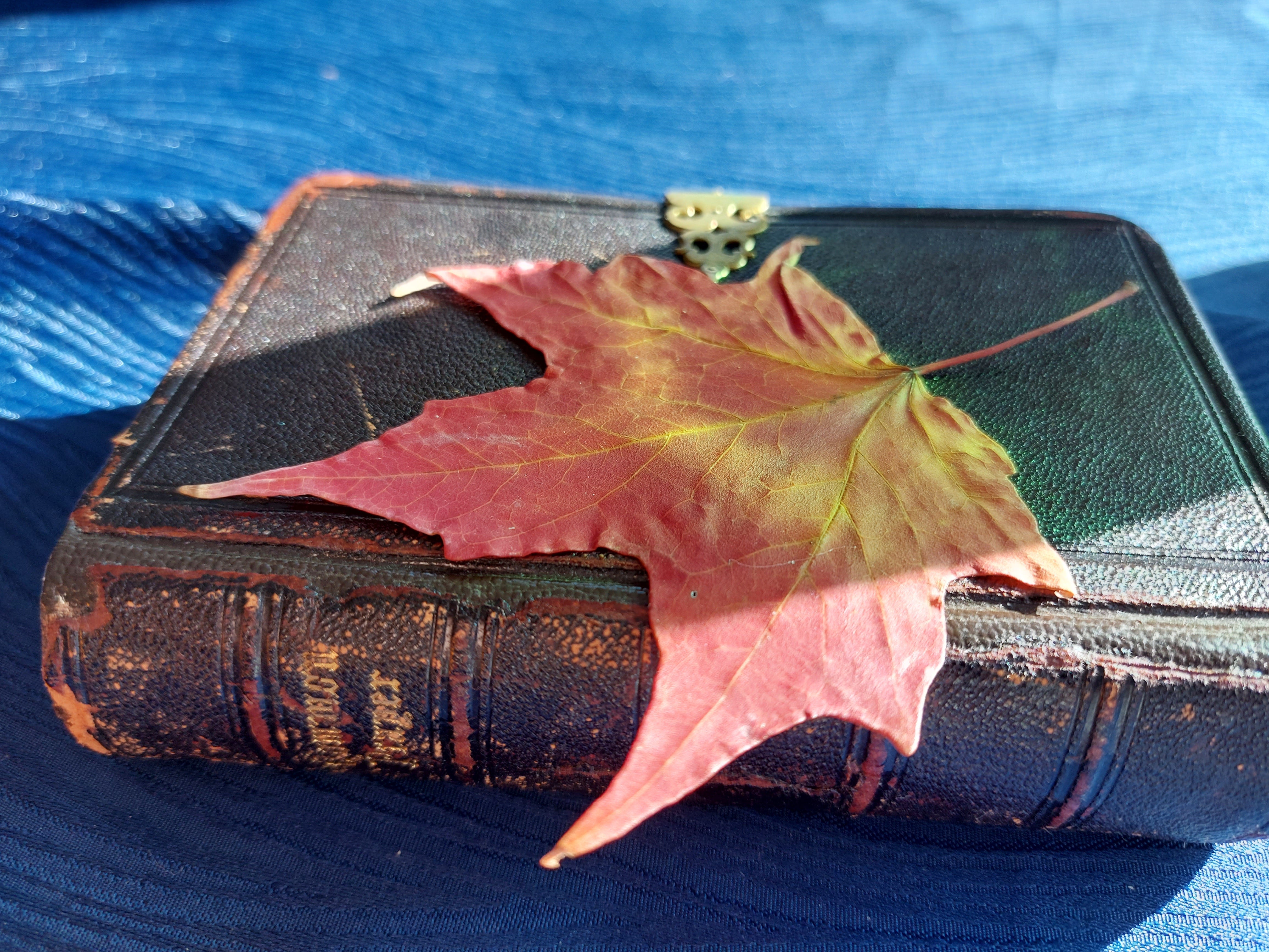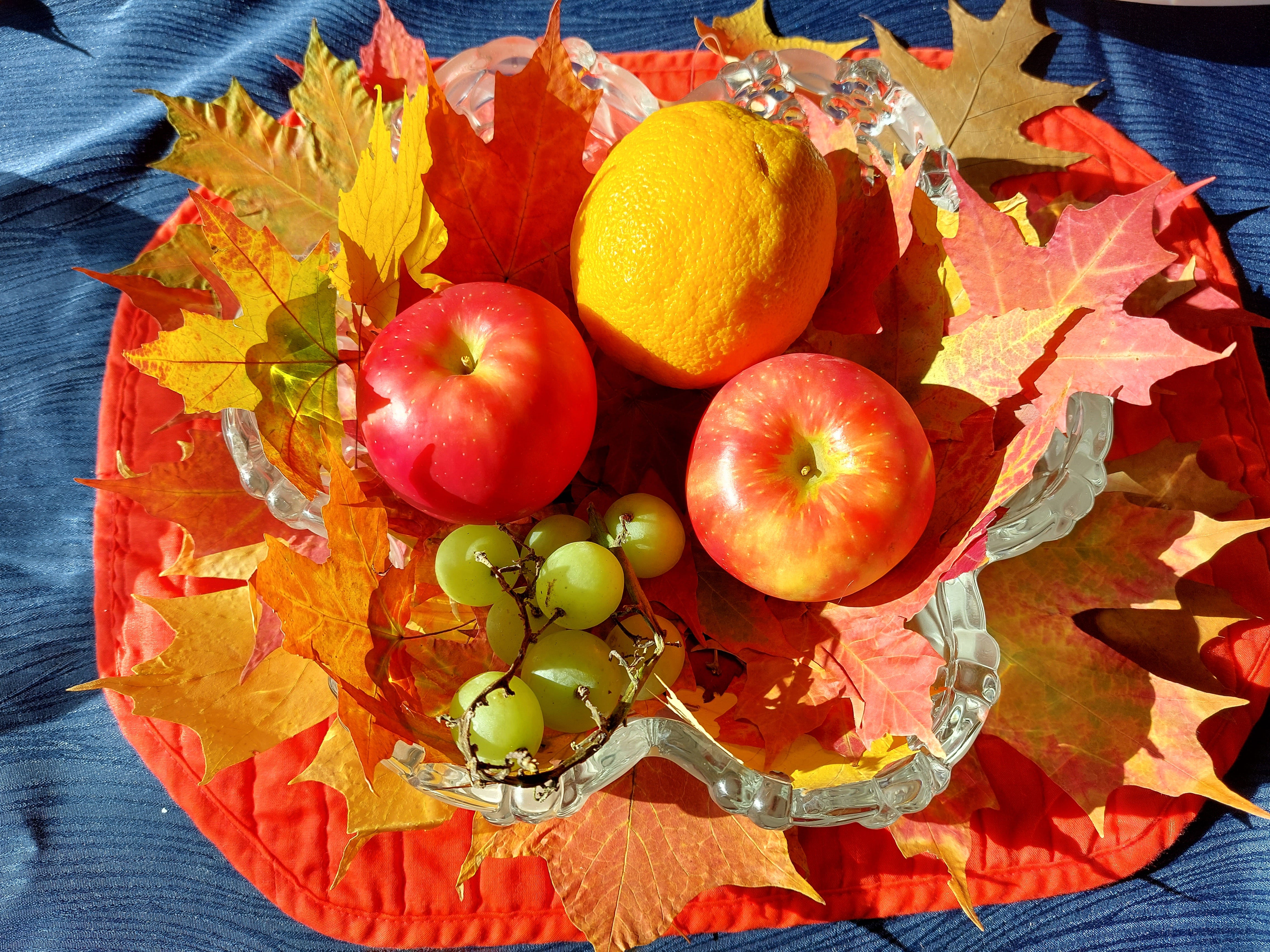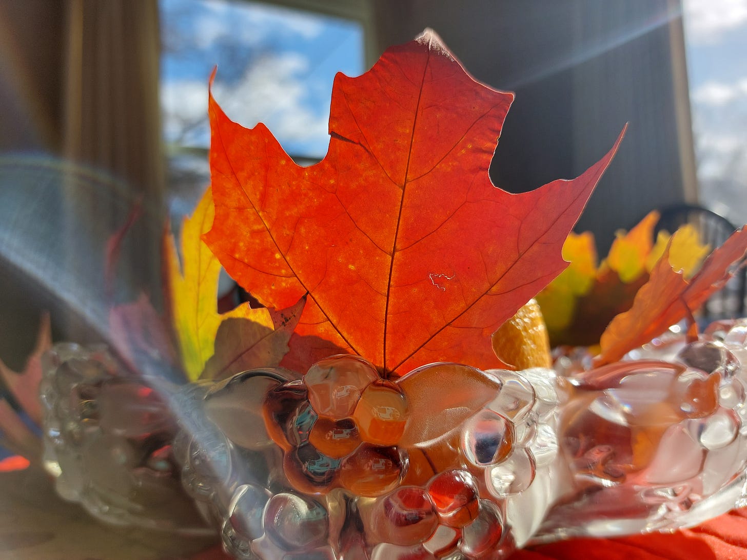 As a Christian, one is supposed to turn to God in such times, and so one does, often. But it is God’s beauty refracted through tangible stuff of earth that brings me the most immediate comfort. In my poem, I allude to my annual photography experiments with our Thanksgiving centerpiece, hoping for sunshine so I can set up a sparkling juice bottle just so. Our family established the tradition of collecting fallen leaves earlier in the season, pressing them between tissues in our outdated World Book Encyclopedia set, then carefully pulling them out to make an autumnal bed for some fruit in a crystal dish. There’s something stabilizing about this kind of beauty for me. When so much is sad, when so much is lost, at least the trees are here. The books are here. The fruit is here.