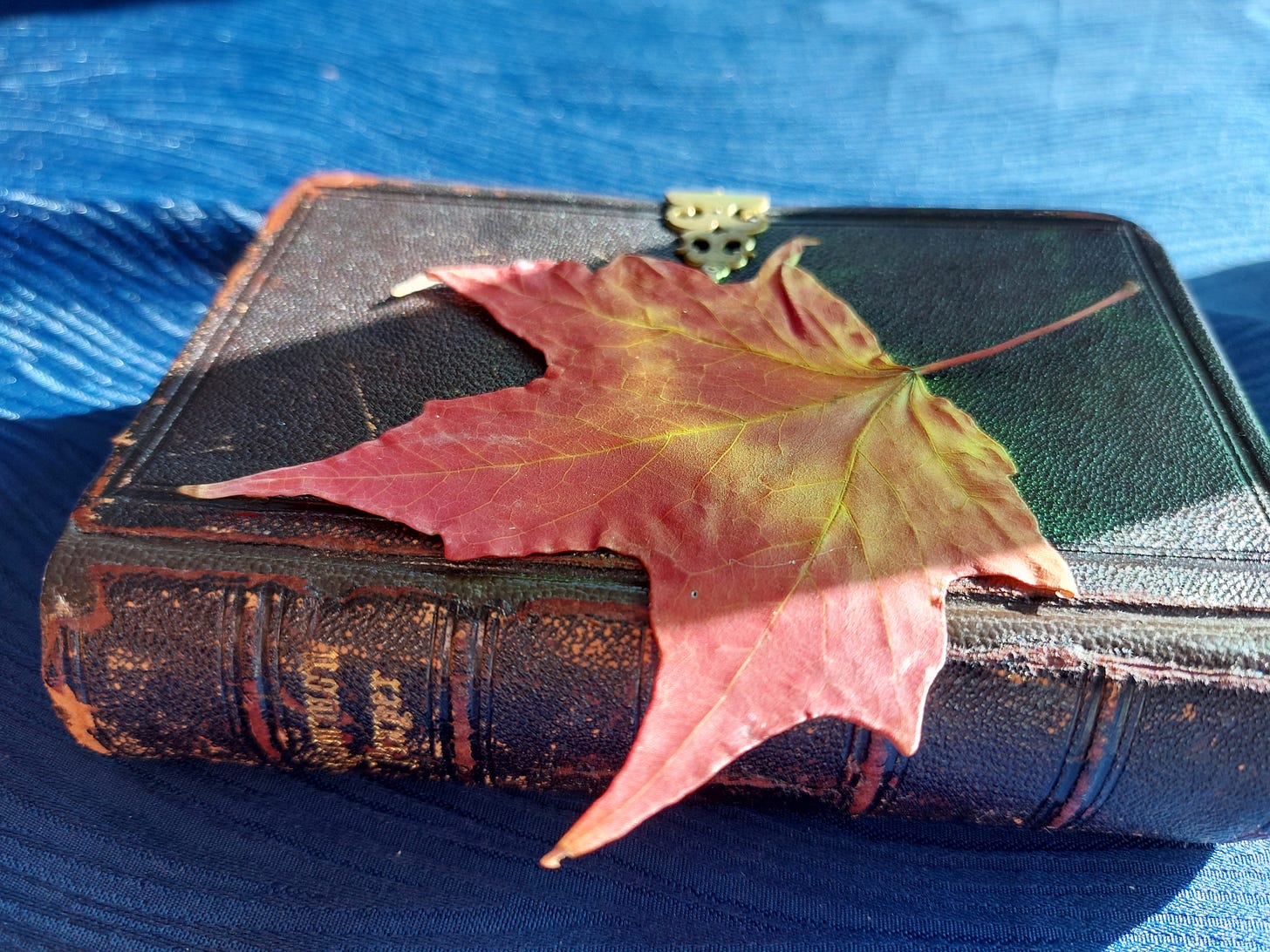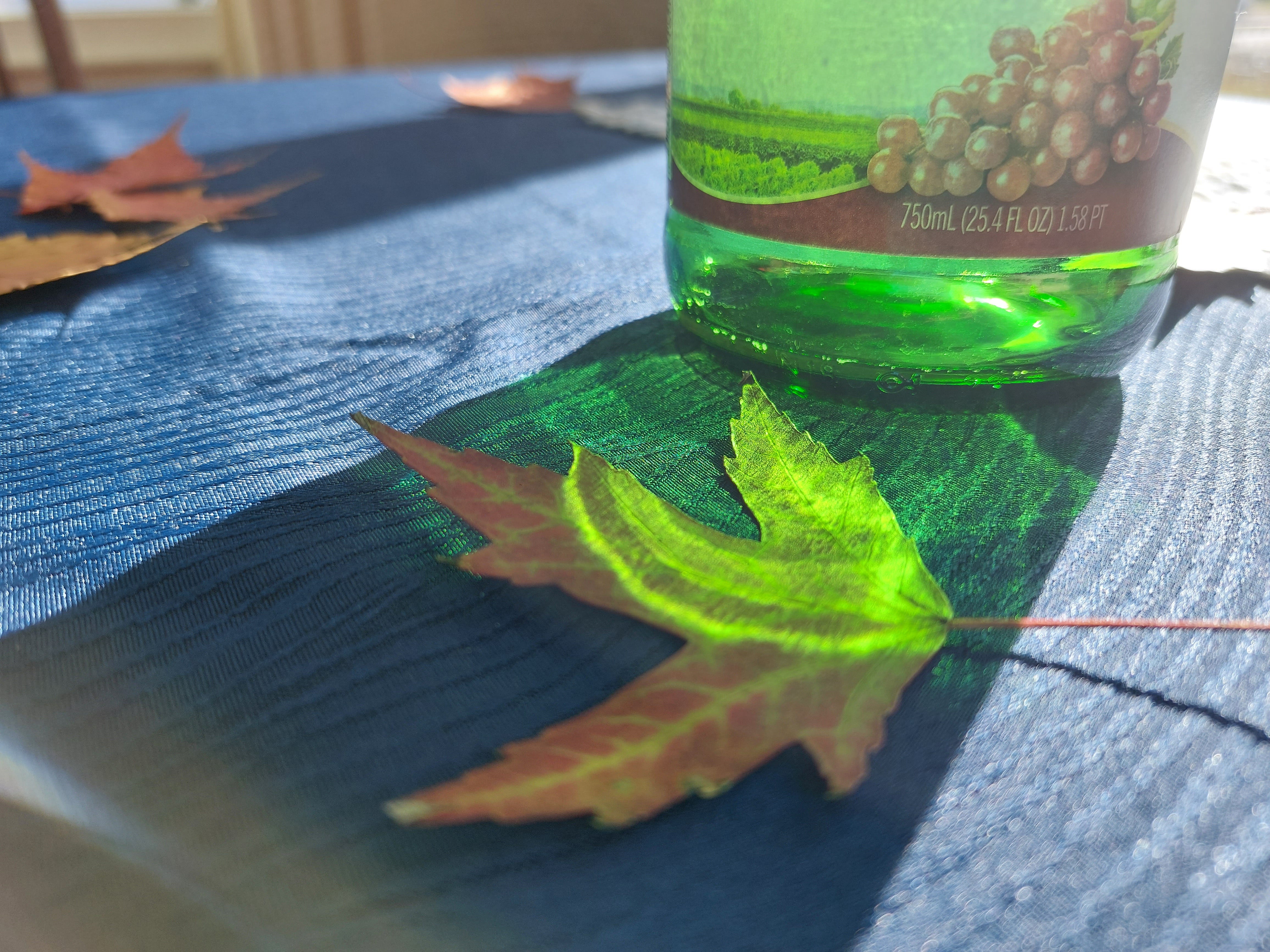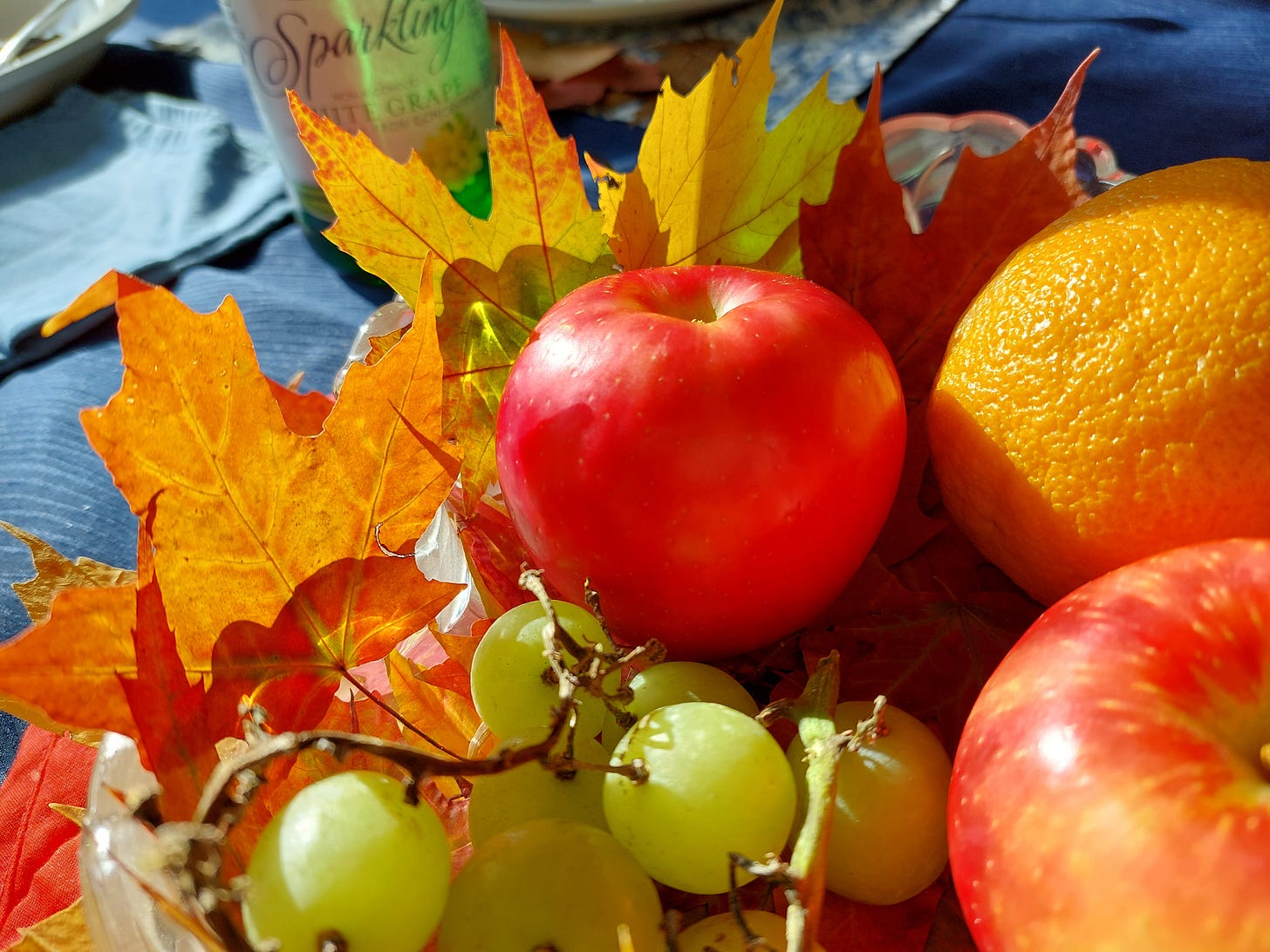 As a Christian, one is supposed to turn to God in such times, and so one does, often. But it is God’s beauty refracted through tangible stuff of earth that brings me the most immediate comfort. In my poem, I allude to my annual photography experiments with our Thanksgiving centerpiece, hoping for sunshine so I can set up a sparkling juice bottle just so. Our family established the tradition of collecting fallen leaves earlier in the season, pressing them between tissues in our outdated World Book Encyclopedia set, then carefully pulling them out to make an autumnal bed for some fruit in a crystal dish. There’s something stabilizing about this kind of beauty for me. When so much is sad, when so much is lost, at least the trees are here. The books are here. The fruit is here.